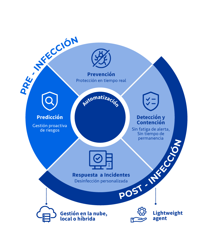 FortiEDR utiliza algoritmos avanzados de IA y Machine Learning para analizar el comportamiento en tus endpoints. Esto le permite detectar anomalías y patrones de ataque nuevos y desconocidos (amenazas de día cero, ataques sin archivos) que las soluciones tradicionales no podrían identificar